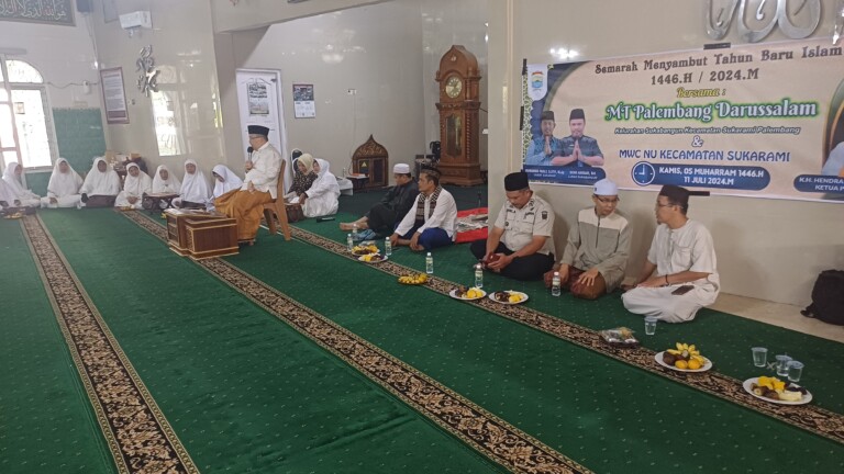 NU Palembang Online – Majelis Taklim (MT) Palembang Darussalam Masjid Al-Ihsan bersama Majelis Wakil Cabang Nahdlatul Ulama (MWC NU) Kecamatan Sukarami semarak menyambut Tahun Baru Islam 1446 Hijriah dengan penuh semangat di Masjid Al-Ihsan pada Kamis (11/7/2024).