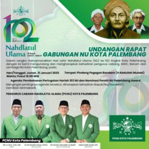 NU Palembang Online – Pengurus Cabang Nahdlatul Ulama (PCNU) Kota Palembang akan menggelar rapat gabungan dalam rangka menyemarakkan Hari Lahir (Harlah) Nahdlatul Ulama (NU) ke-102 tingkat Kota Palembang. Rapat tersebut dijadwalkan pada Jumat, 31 Januari 2025 pukul 19.00 WIB di Pindang Pegagan Bandara (H. Abdullah Mutaal).